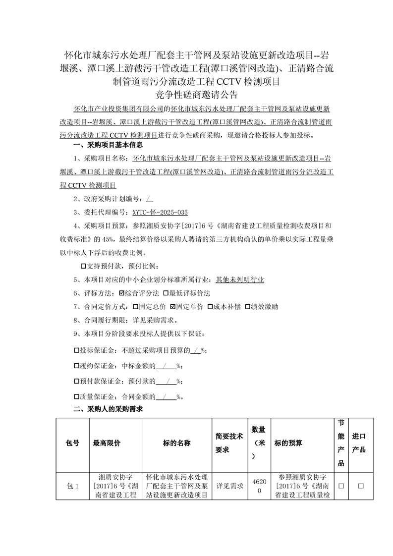 懷化市產(chǎn)業(yè)投資集團有限公司的懷化市城東污水處理廠配套主干管網(wǎng)及泵站設施更新改造項目--巖堰溪、潭口溪上游截污干管改造工程(潭口溪管網(wǎng)改造)、正清路合流制管道雨污分流改造工程CCTV檢測項目競爭性磋商邀請公告