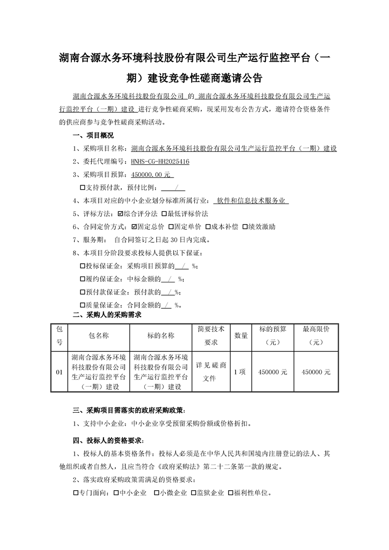 湖南合源水務(wù)環(huán)境科技股份有限公司生產(chǎn)運行監(jiān)控平臺(一期)建設(shè)競爭性磋商邀請公告